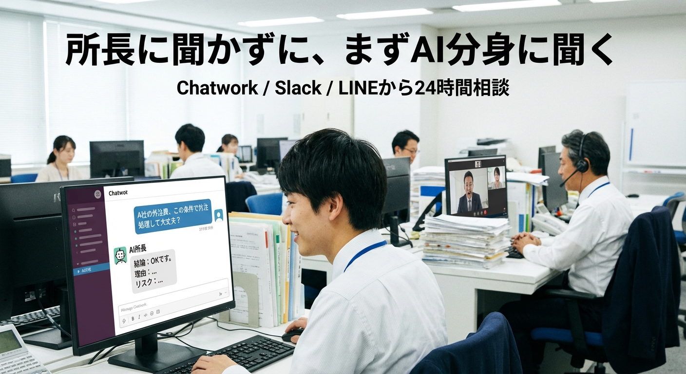 既存メール・議事録・稟議フローを学習素材に。Chatwork/Slack等に接続